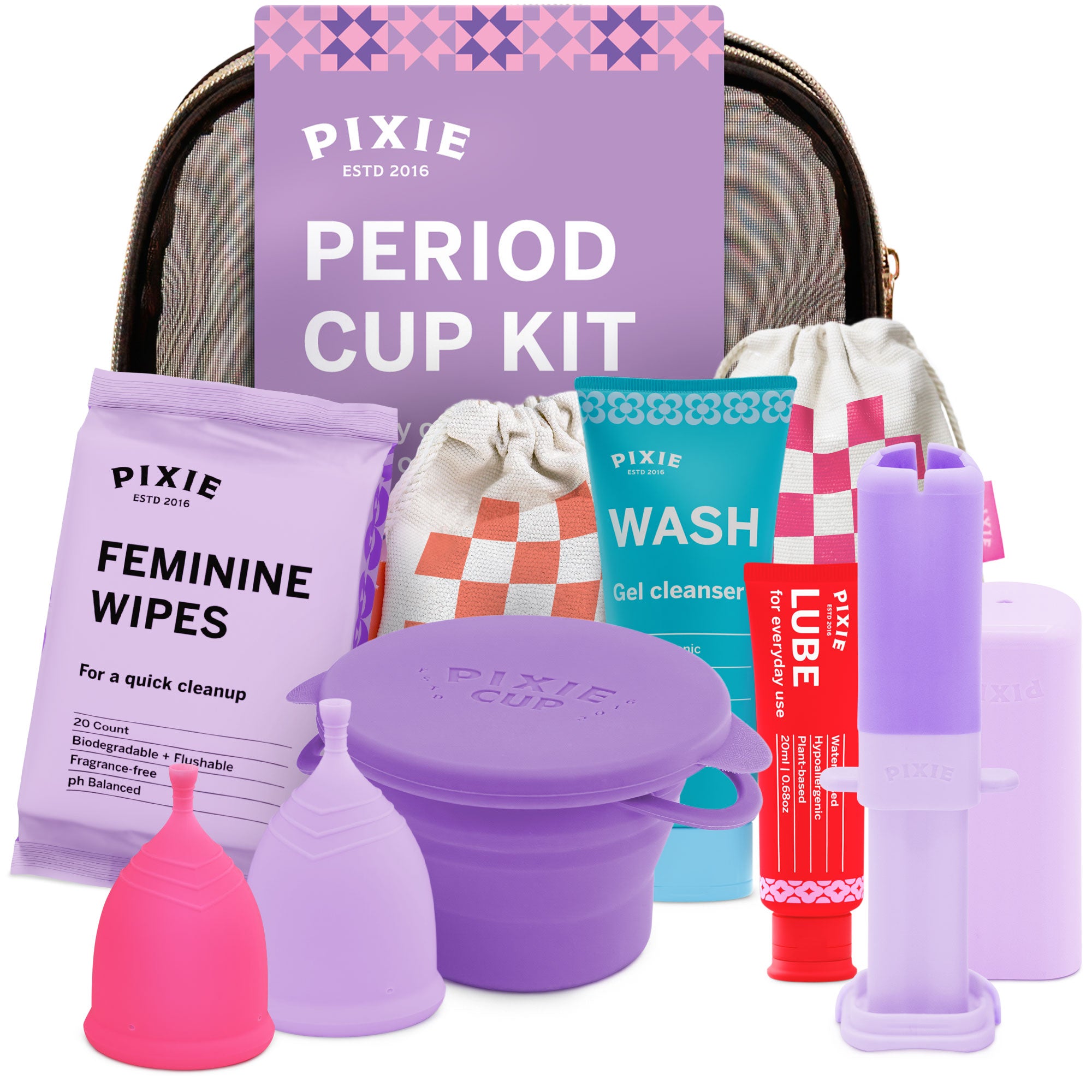 At Pixie Cup, we're committed to making cup-life simple. Not sure what size is best? We've included two sizes - one for your light days and one for your heavy days. Inserting your cup should be smooth, so we included our INNOVATIVE Cup Applicator and travel lube. Using your cup in public shouldn't give you anxiety, so we included our wipes and carry cup to keep you clean on the go. Our Gel Wash is the perfect gentle + effective cleanser to take care of you and your cup.
